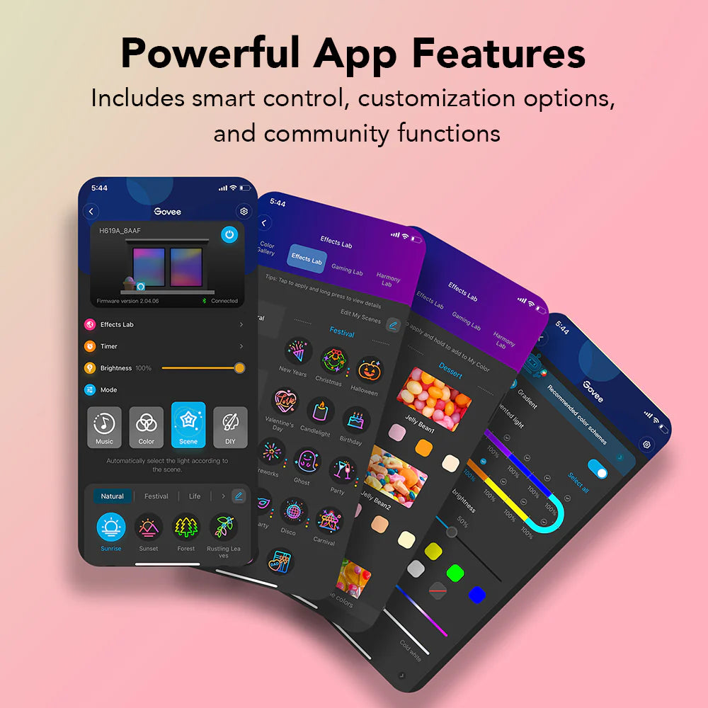 Govee Home -sovelluksen avulla saat käyttöösi erilaisia jännittäviä ominaisuuksia valoillesi, mukaan lukien 64+ esiasetettua tilamuotoa ja musiikkitilatoiminnon. Tarjolla on yli 16 miljoonaa värivaihtoehtoa, jotka sopivat kaikkiin tilanteisiin.
