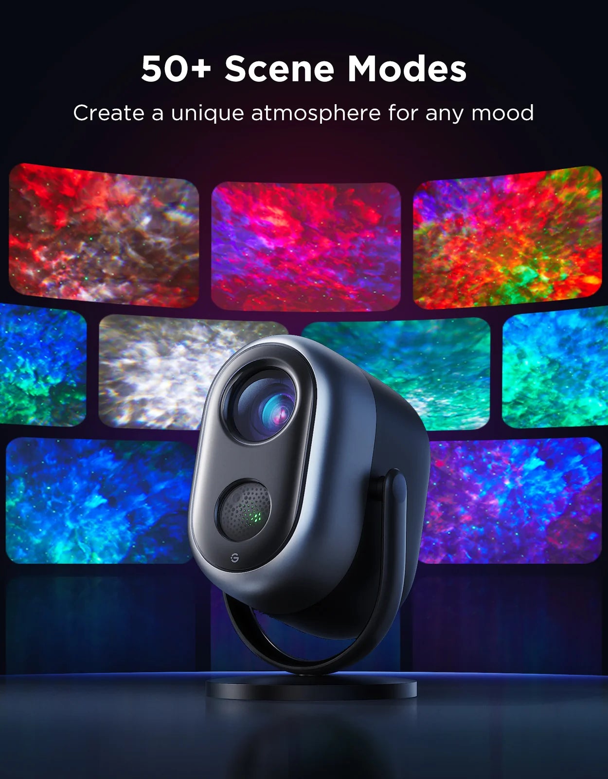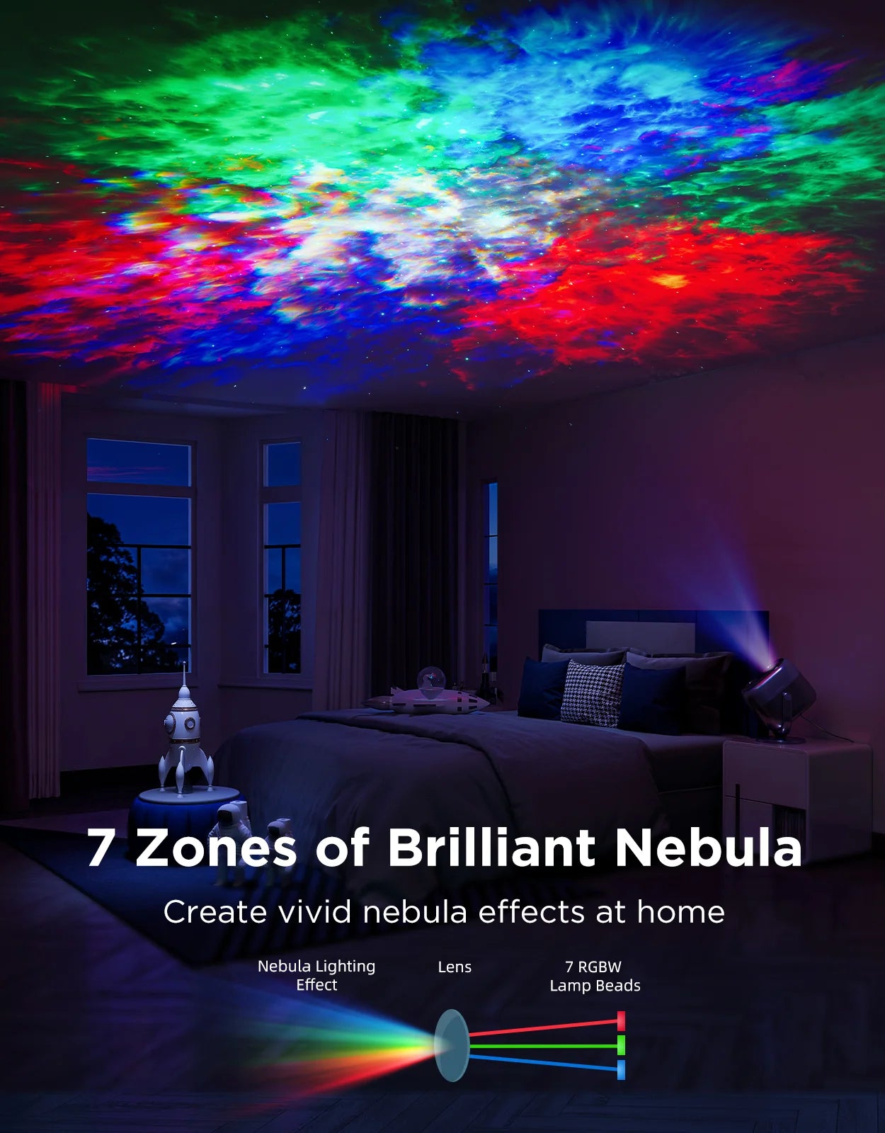 - 🌌 7-vyöhykkeinen sumuprojektio – Jokainen valovyöhyke on erikseen ohjattavissa, jolloin syntyy elävät ja moniulotteiset tähtisumu-efektit.