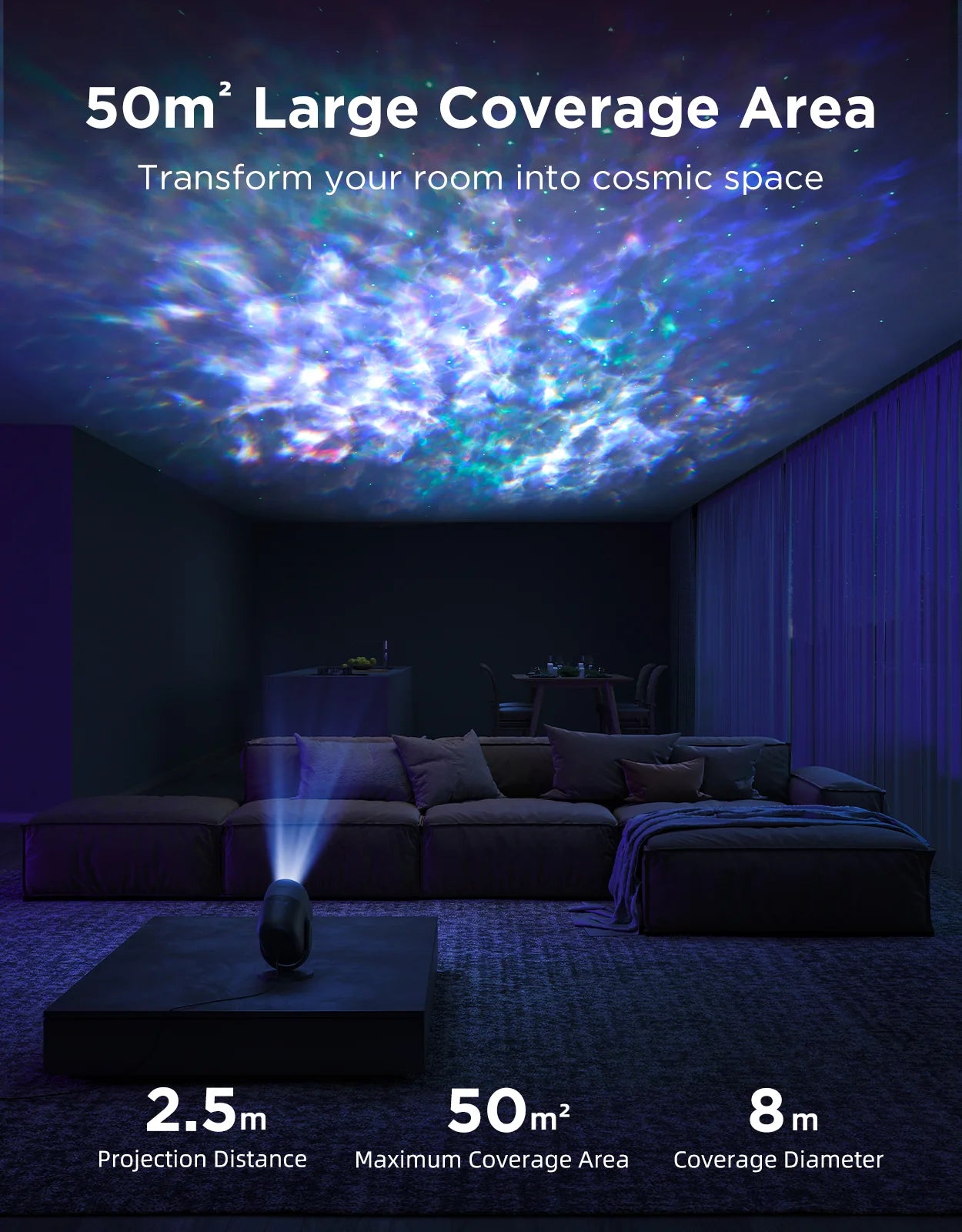 - 🏠 Jopa 50 m² peittoalue – Valo kattaa koko katon ja seinät luoden syvän immersiivisen kokemuksen.