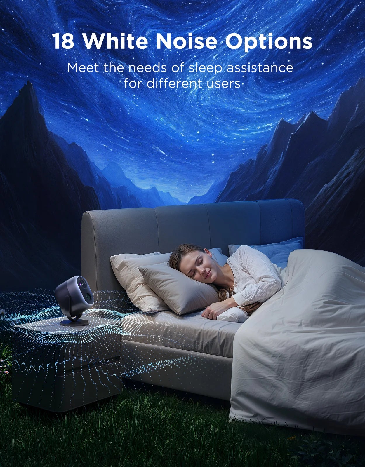 - 🎵 Ääni + valo -rentoutus – Bluetooth-stereo ja 18 valkoisen kohinan äänivaihtoehtoa rauhoittavat uneen tai meditaatioon.