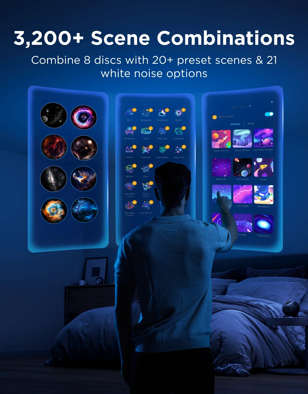 ✔ Yli 3 200 valo- ja äänikombinaatiota – 8 vaihdettavaa levyaihetta, 20 valoteemaa ja 21 rauhoittavaa valkoisen kohinan ääntä
